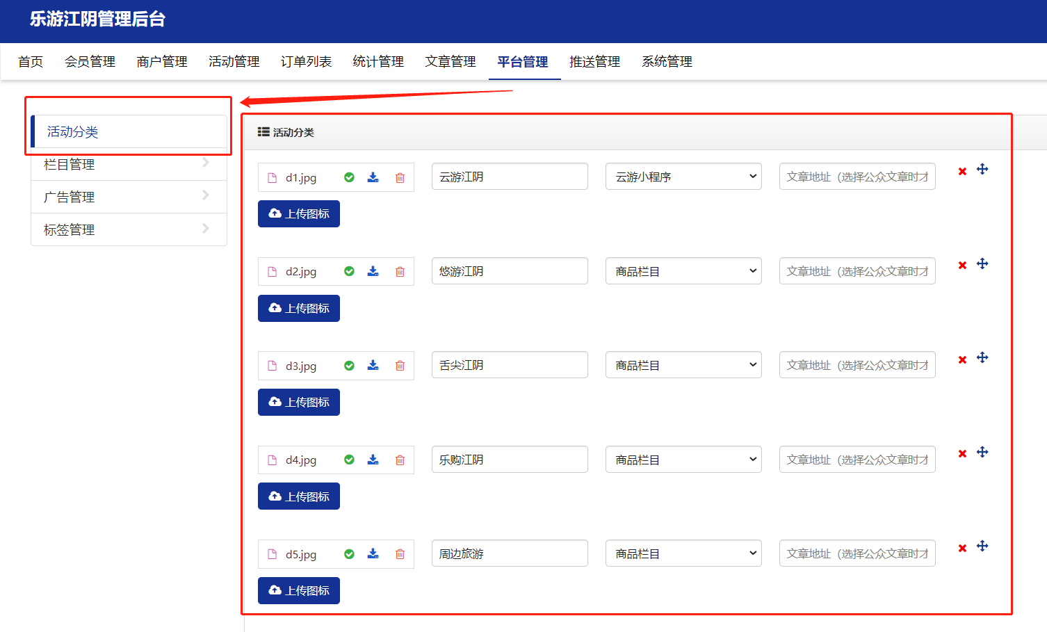 在平台管理-活动分类中 上传分类图标,分类的名称,选择分类