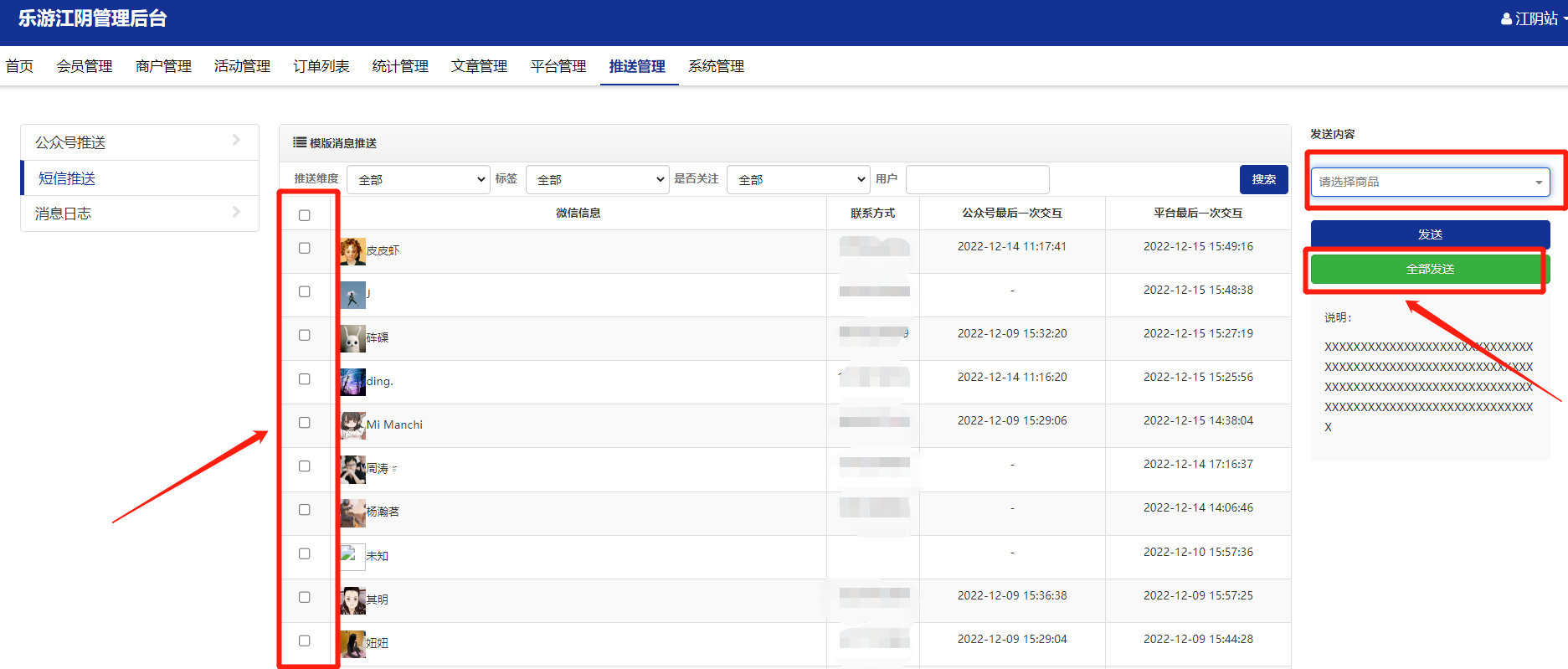 勾选第一个框或点击【全部发送】可以发送给所有用户