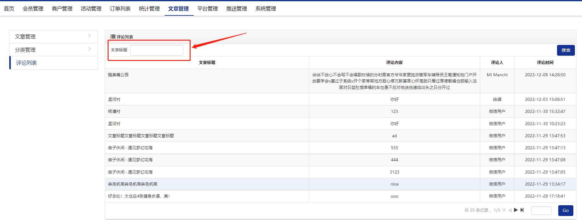 用于展示所有文章的评论。可以通过文章标题搜索想要查看的文章评论