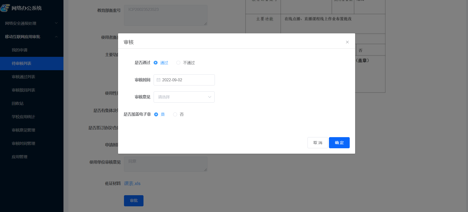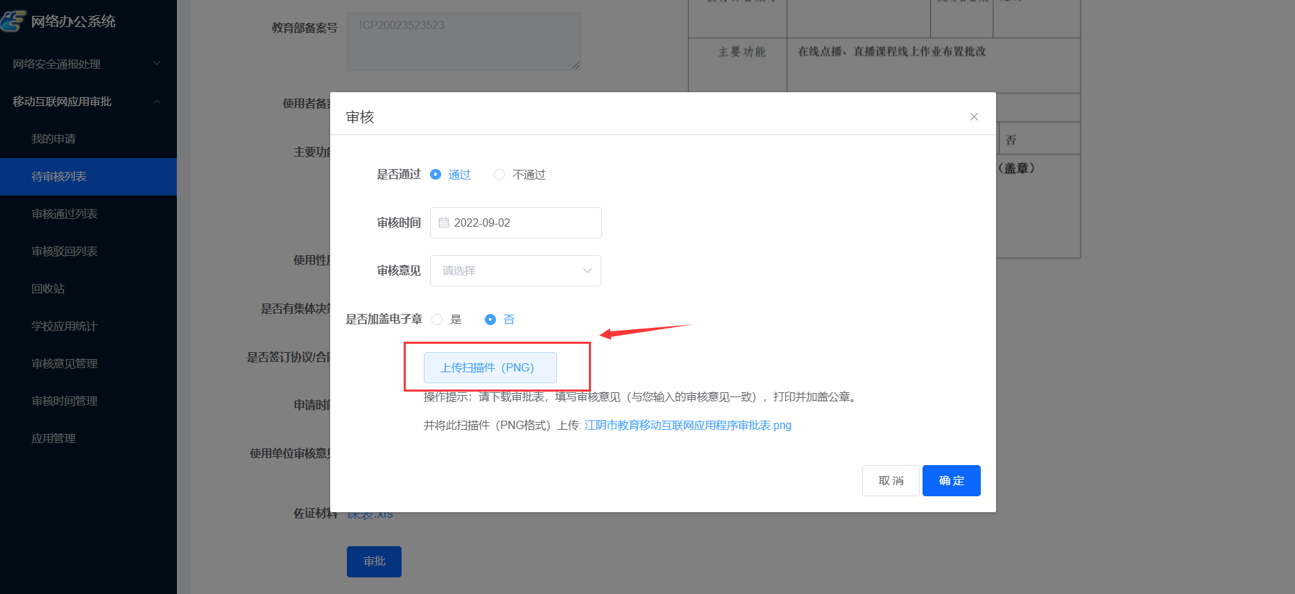 填写审核信息,包括审核时间,审核意见,是否加盖电子章,如果选择不加盖电子章,需要手动上传审核文件