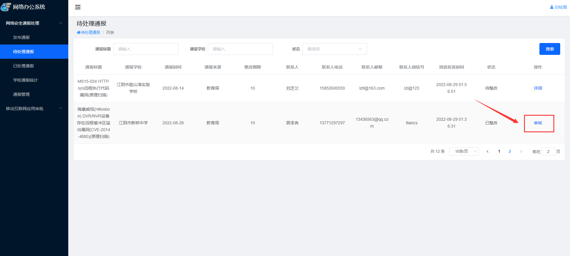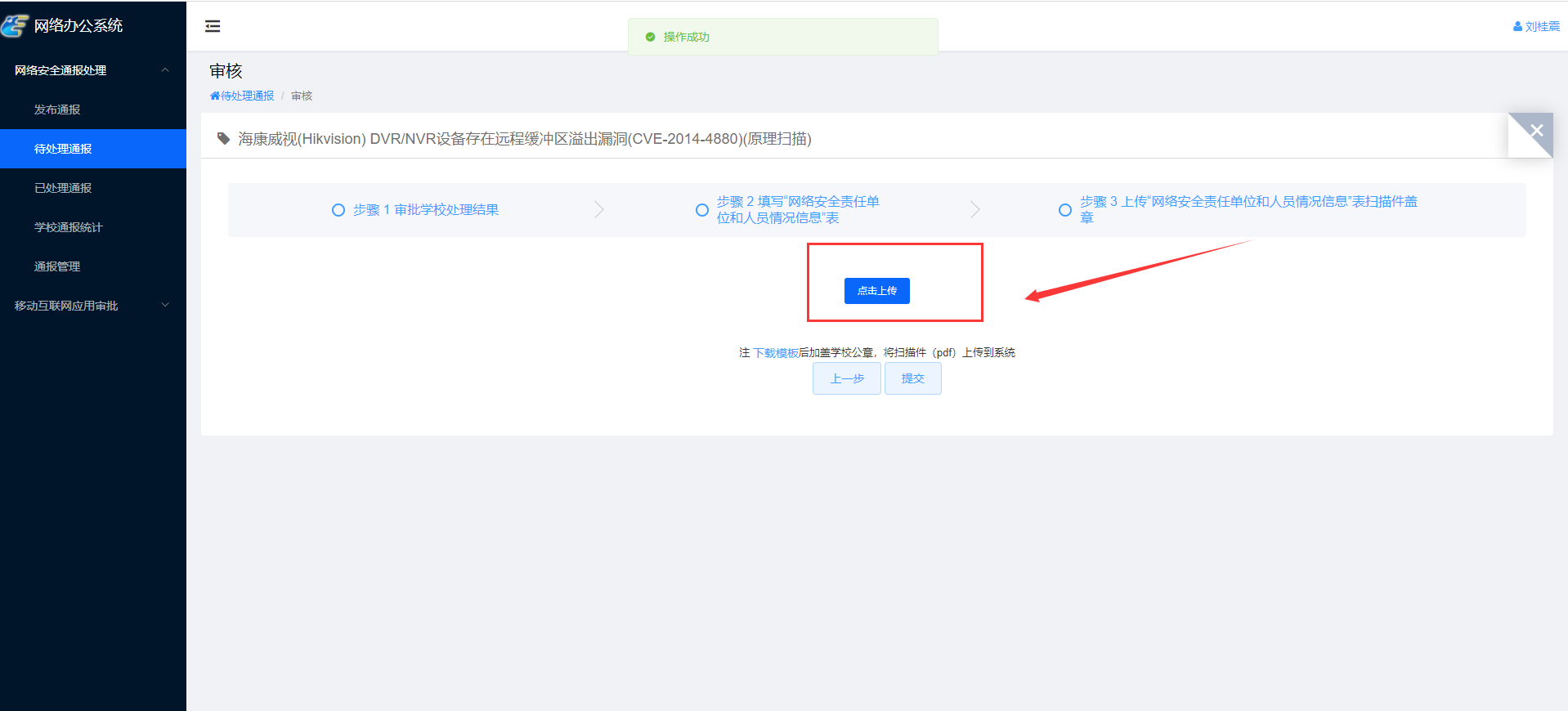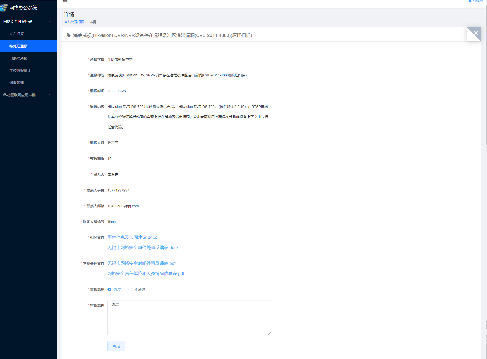 如果通报来源是公安局,教育局审核后要填写网络安全责任单位与负责人信息,并提交扫描文件