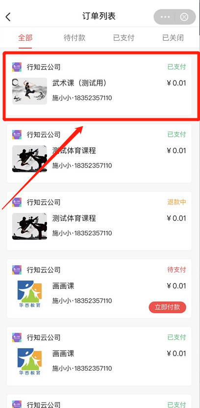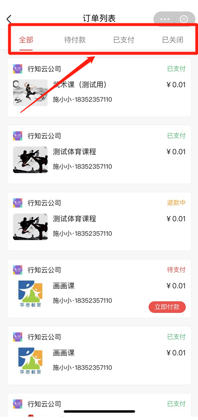 家长可以在最江阴APP中查看 已支付,待支付,退款中的订单及订单详情