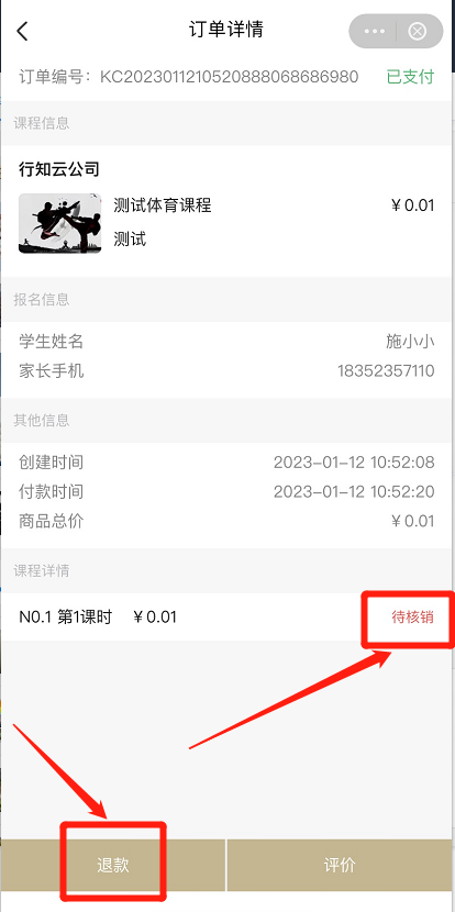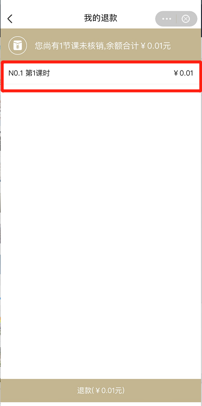 家长点击退款,统计未核销的所有课时生成退款申请,点击退款,等待机构审核。
