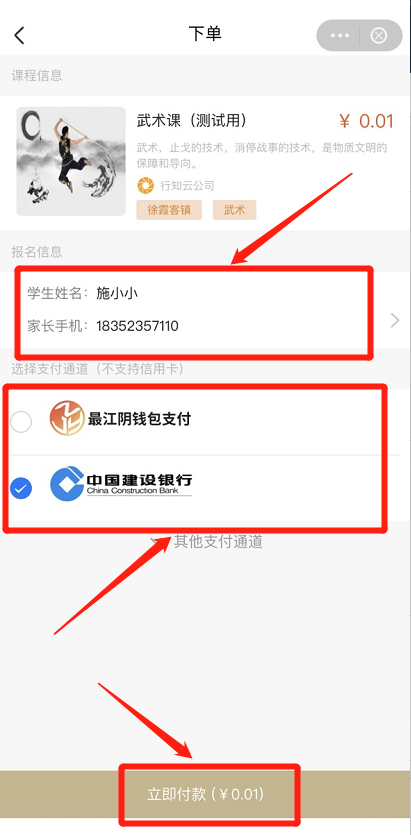依次点击 最江阴APP--校外培训监管--课程--课程详情--立即报名--选择报名学生及支付通道--立即付款