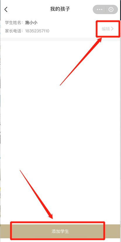 学生信息家长名下的学生信息(学生的查看,新增,编辑)依次点击 最江阴APP--校外培训监管--我的--我的孩子新增与编辑点击编辑,即可对现有学生信息进行修改点击 添加学生,填写学生姓名及家长手机号,建议正确填写,方便后期机构联系