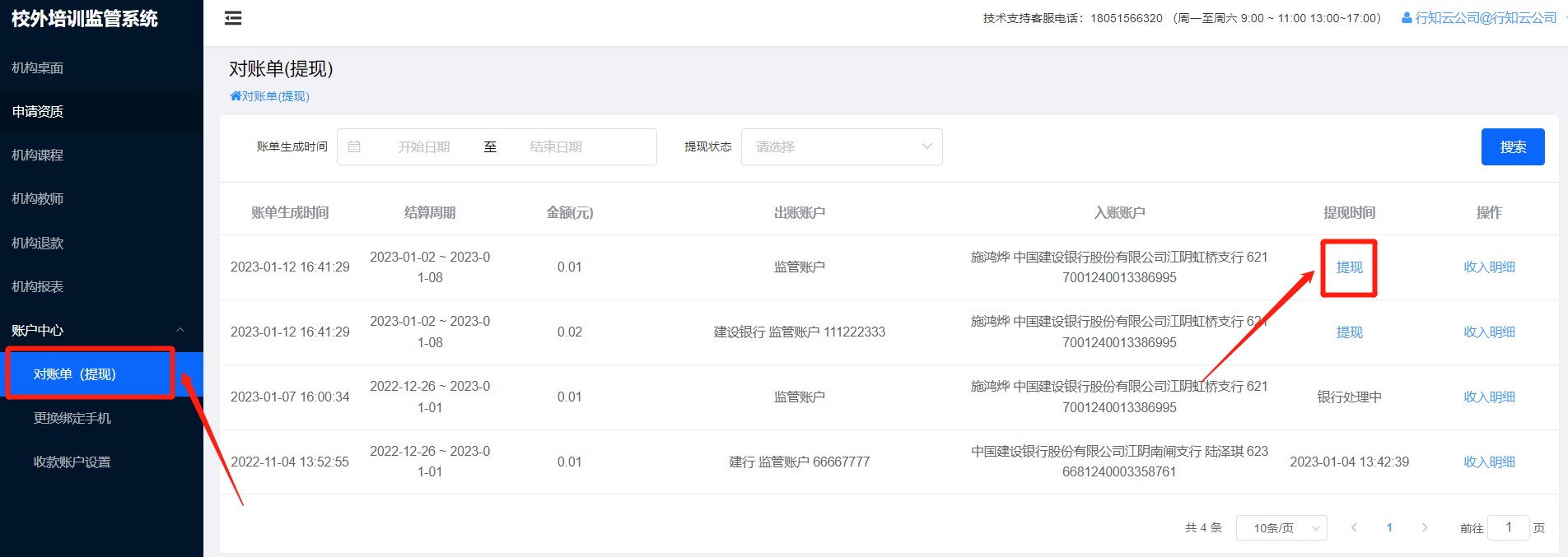 对账单(提现)发送验证码到绑定手机验证,验证成功,提交提现申请给监管银行,监管银行打款给机构。若监管账户金额不足,则提现失败,需等待1-3个工作日后再次发起提现。注:提现操作后,状态变为银行处理中,每周一结算可提的金额,等待监管银行打款给机构