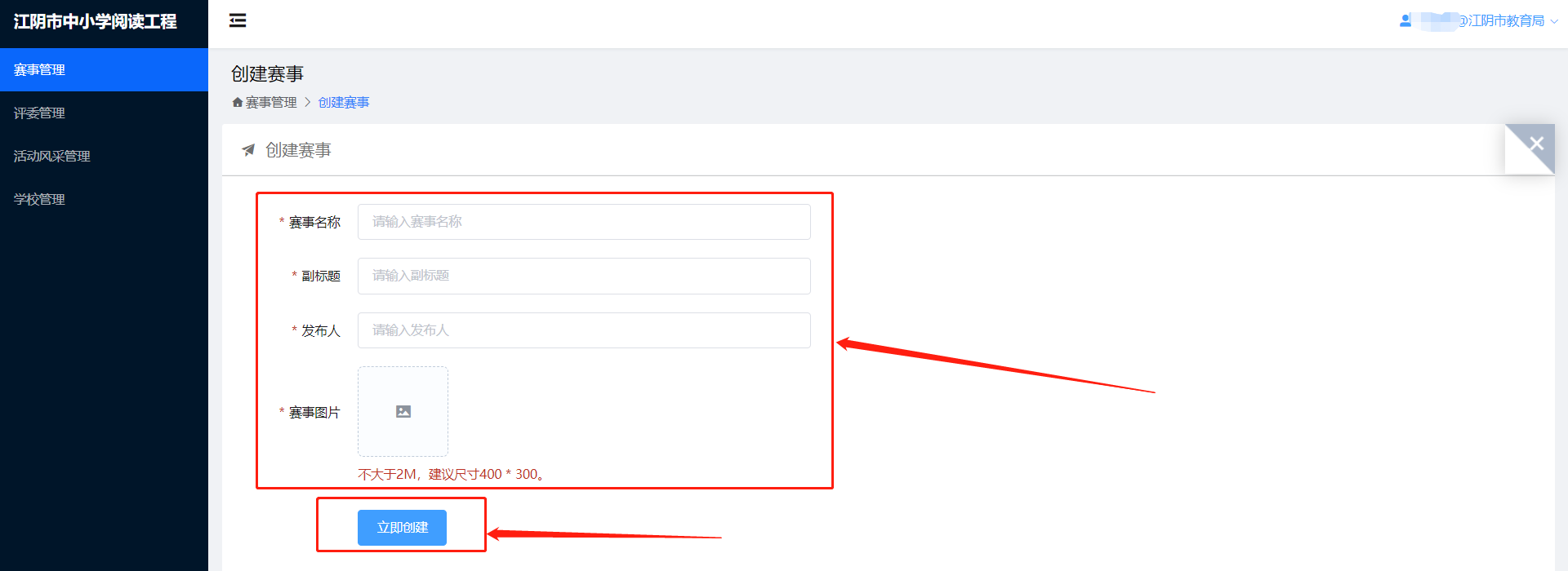 点击新增赛事,填写相关信息后,点击立即创建,即可完成新增赛事。