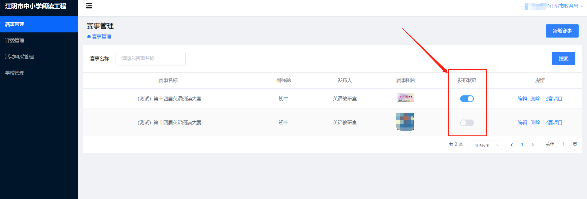 发布状态的开启与关闭控制该赛事在家长手机端是否可见。
