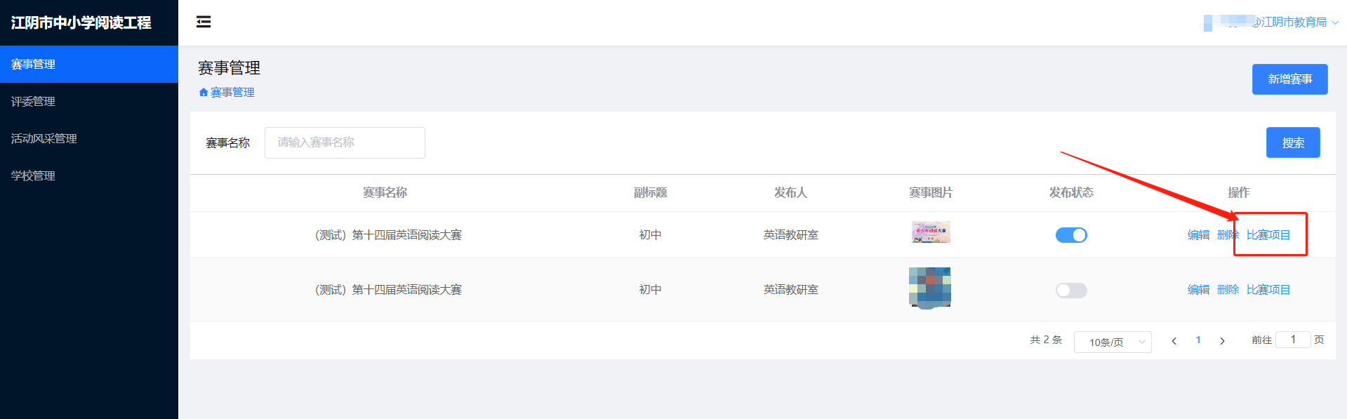 点击比赛项目,在比赛项目页面新增和维护项目。
