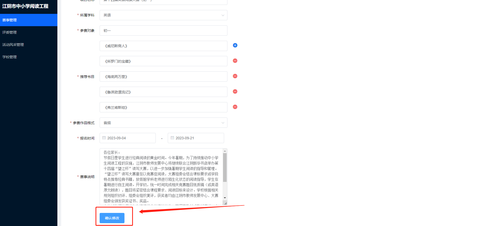 创建比赛项目后,如需修改,可点击编辑,修改内容后点击【确认修改】。