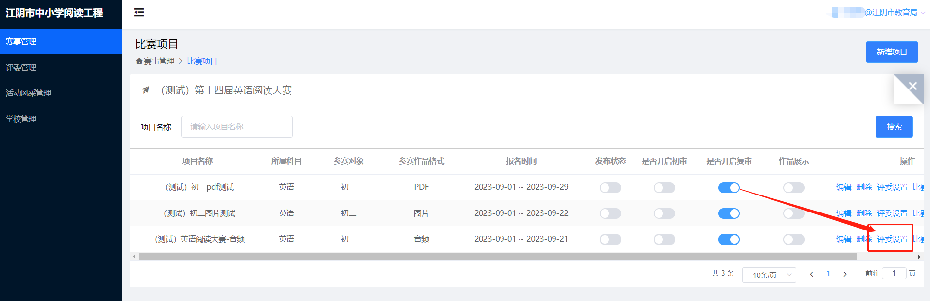 发布状态、是否开启初审、是否开启复审、作品展示状态按钮,全部开启即为家长可见、初审人员可见、复审人员可见。如关闭,则对应人员不可见且不可操作。