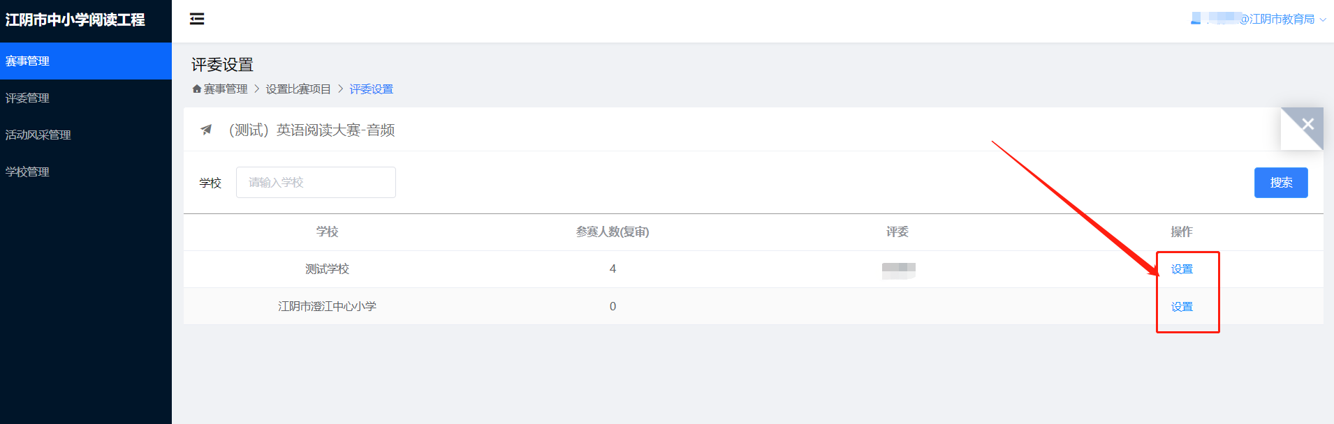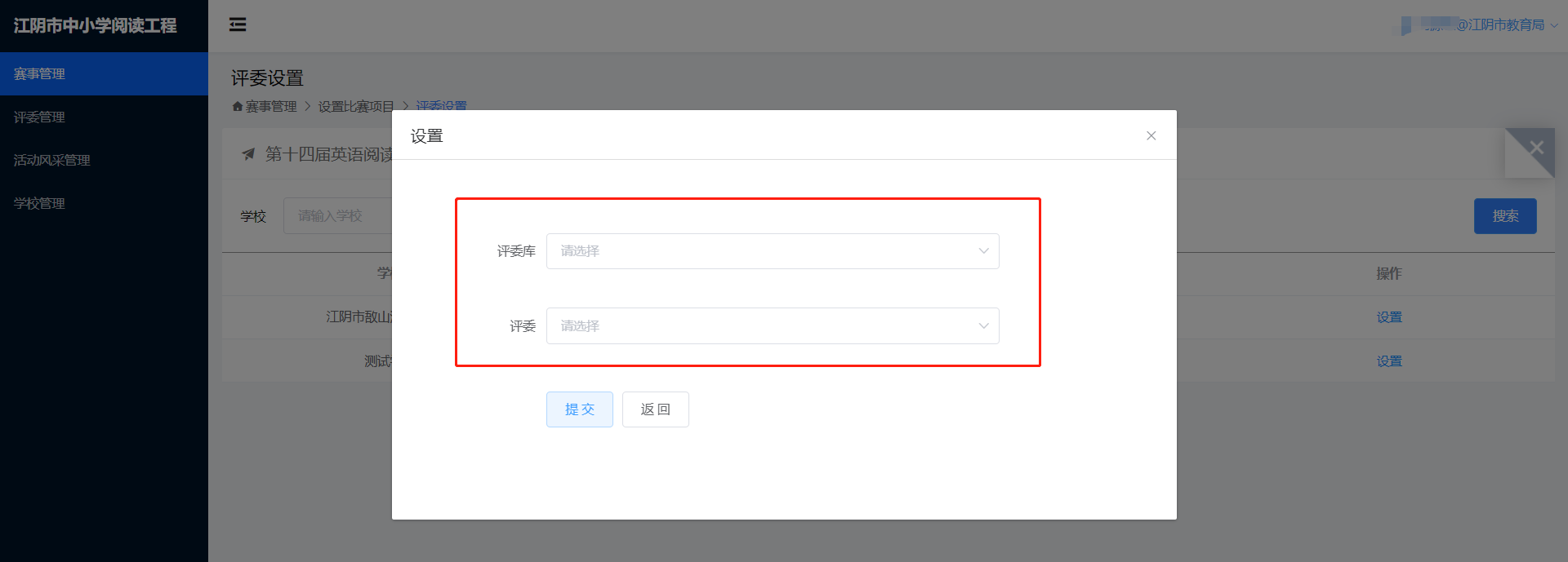 点击学校后的设置,评委库与评委为关联查询,先搜索评委在选择评委库下的老师。