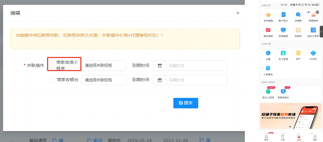 (2)或者 代理在后台内为商家授权独立小程序插件(自动按照等级折扣扣除预存款)