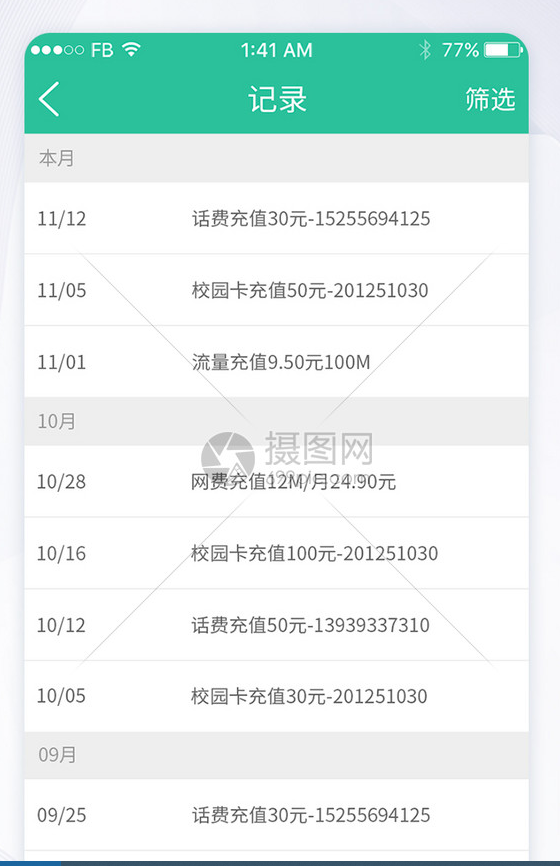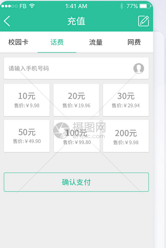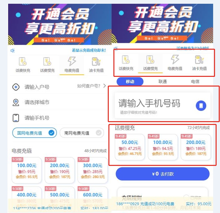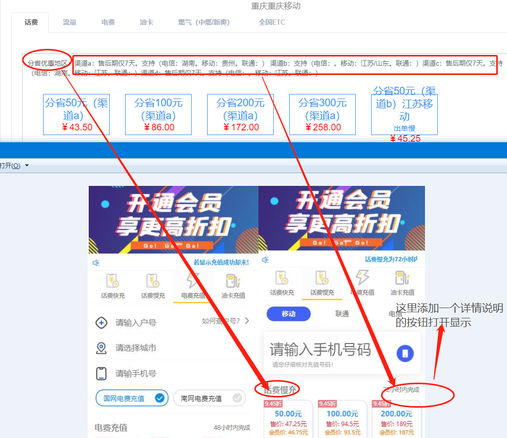 ①分类显示,②手机输入框,③各渠道面值显示方式