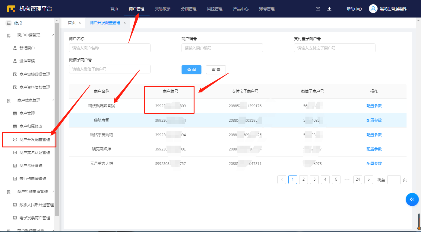 进来后看商户管理---商户开发配置管理----右侧有对应的商家名称和商户编号--复制下来这家店的商户编号。