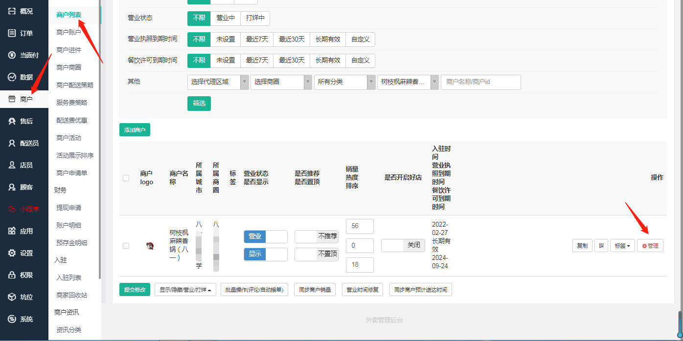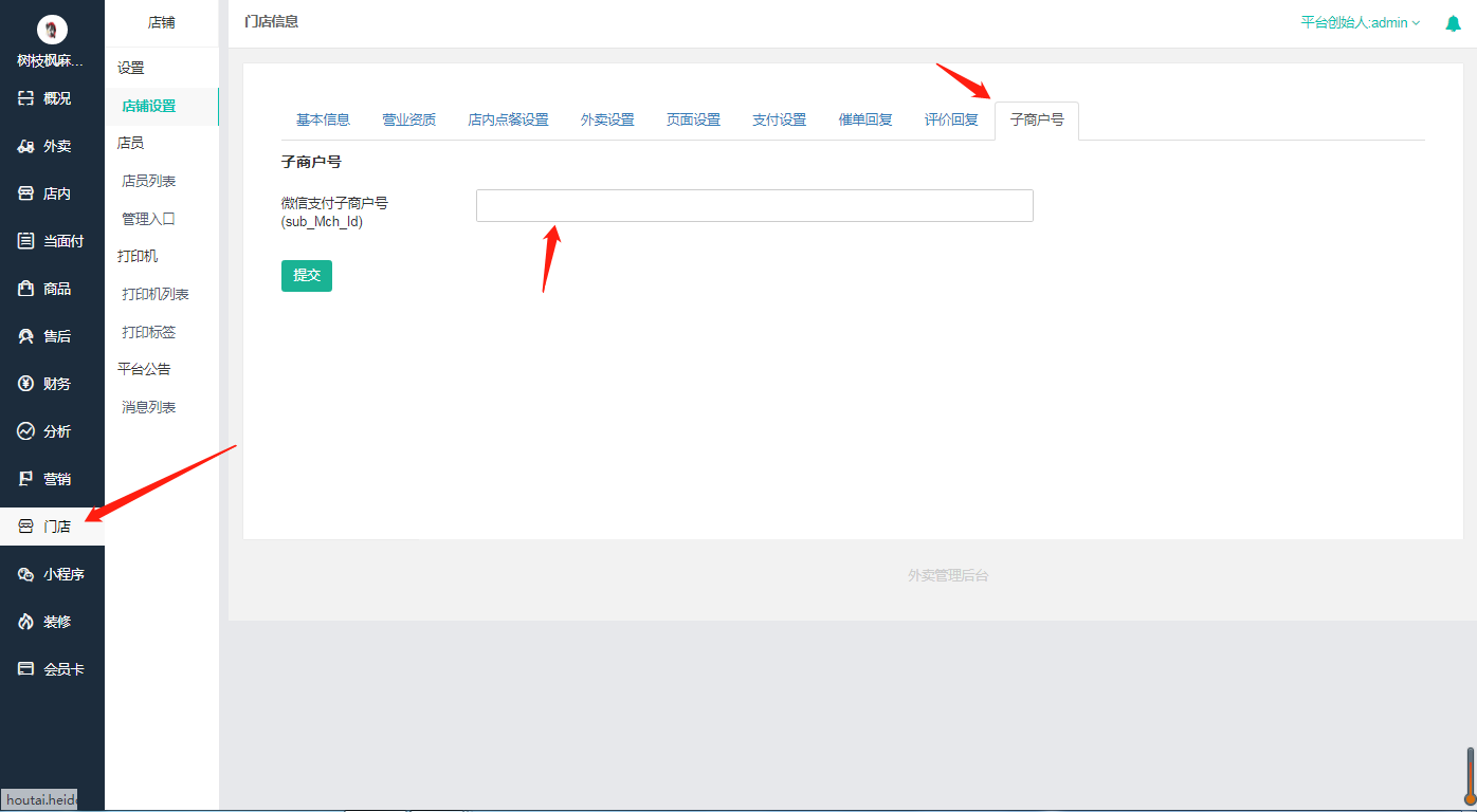 2.打开外卖后台进入商家后台看下图3 把随行付复制下来的编号填写进商户后台的子商户号里面(这里一点要核对清楚千万不能把其他加的填错了)ps:特别说明 保存完一家店记得关闭这家店再去打开另一家店