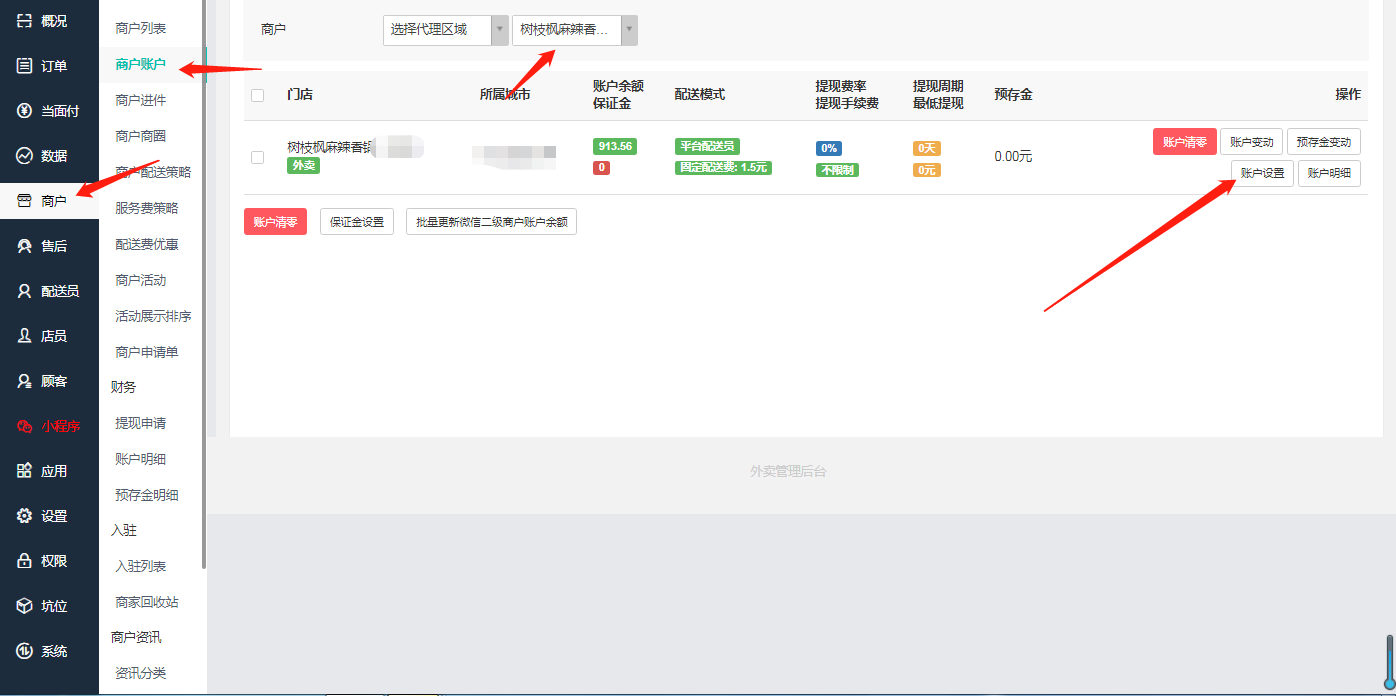 填写完后点击保存,我们接下来来看最后一步也是最重要的一步 返回商户 找商户账户 找到对应的门店 点击账户设置