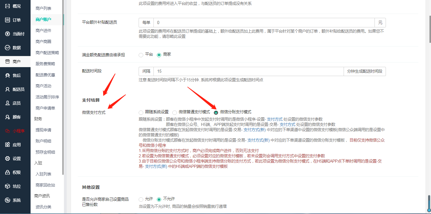 进来后往下拉找到支付结算,一定要选择为微信分账支付模式,(不然无法实现随行付支付)到这里就是最后一步了 感谢大家
