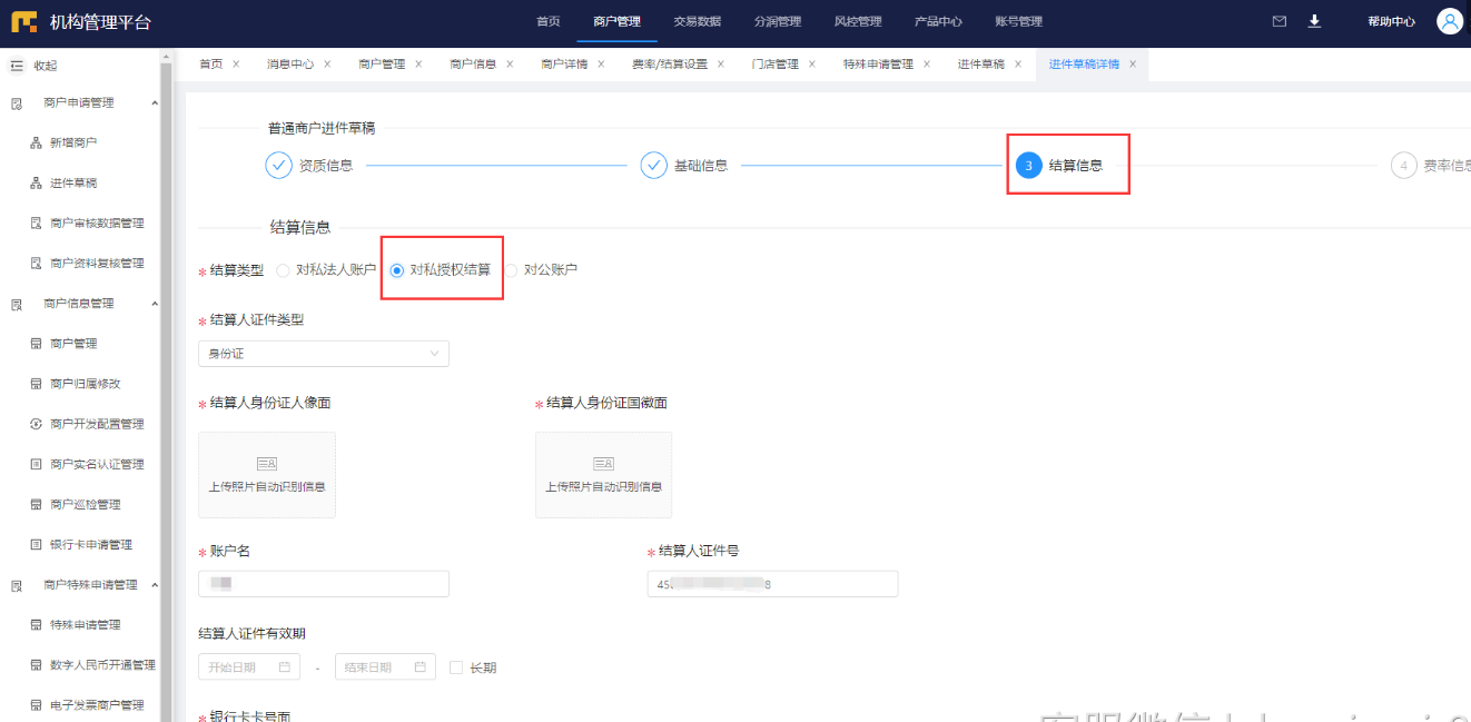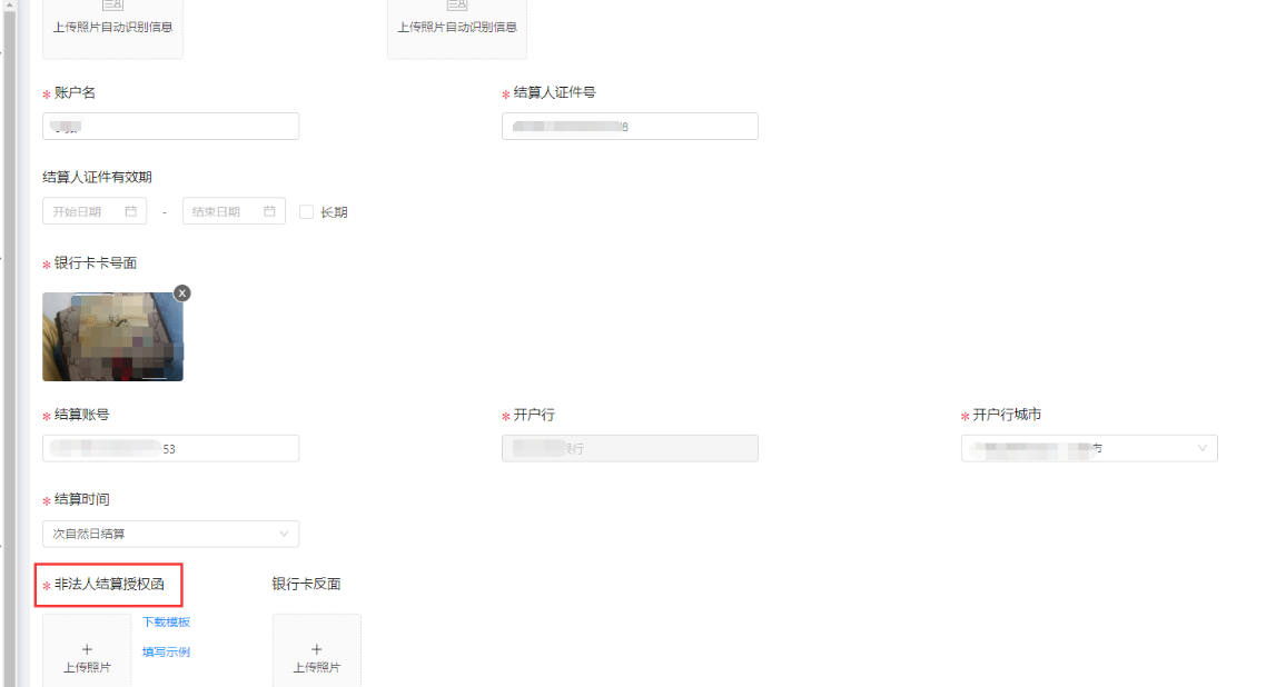 新增商户进件时候,填写结算信息的时候可以选择非法人结算,填写非法人信息,提供非法人结算授权函