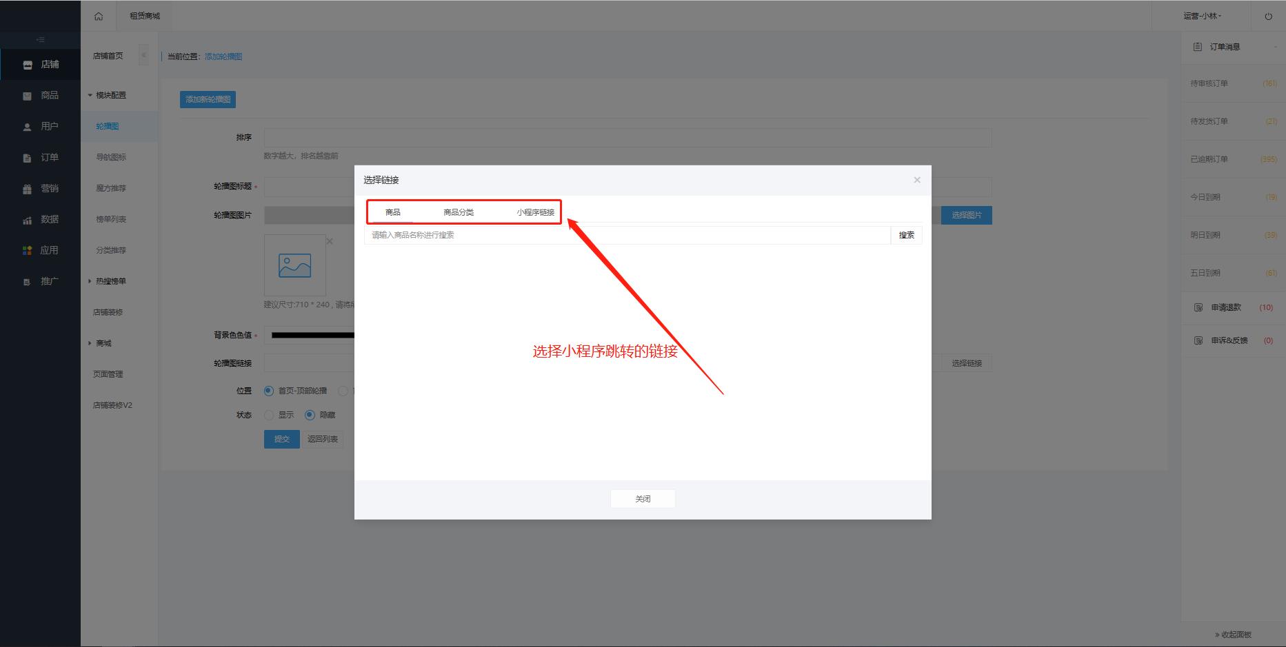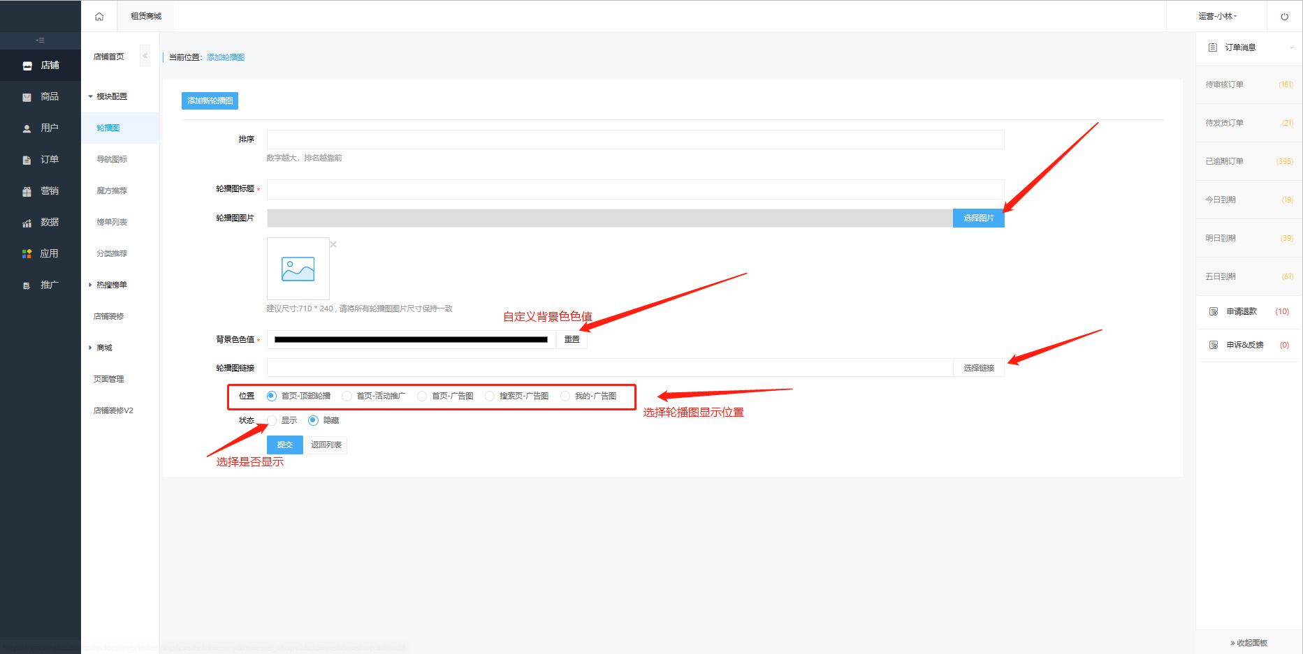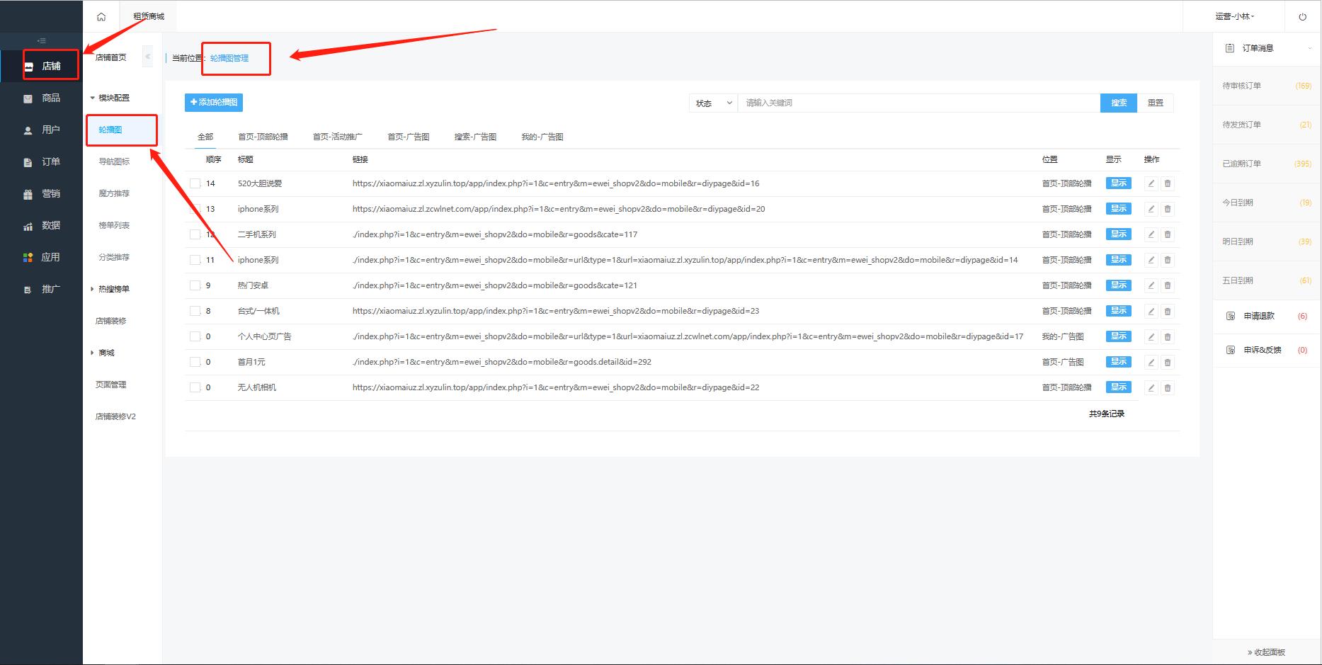 进入平台管理后台,点击“店铺-轮播图”,可添加、编辑轮播图;
