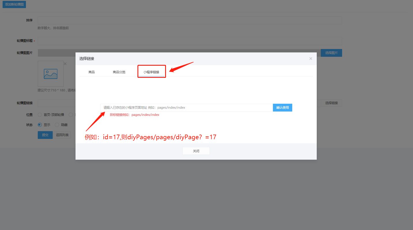 ① 选择你要在那个位置(轮播图、魔方推荐、导航图标、广告图)跳转自定义落地页② 例如:轮播图跳转至落地页③ 小程序链接:④ 自定义页面:diyPages/pages/diyPage/diyPage?id= ⑤ 企业租赁:orderPages/pages/enterpriseLeaseNew/enterpriseLeaseN⑥ 多商户申请页:infoPages/pages/businessesMoveIn/businessesMoveIn