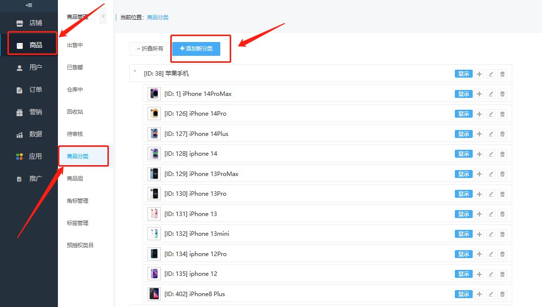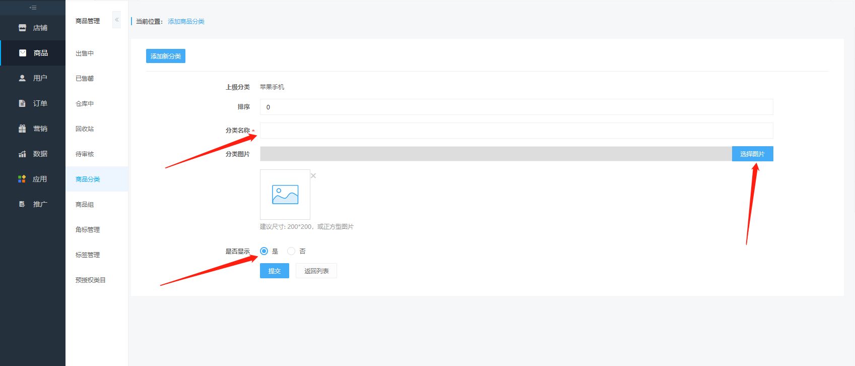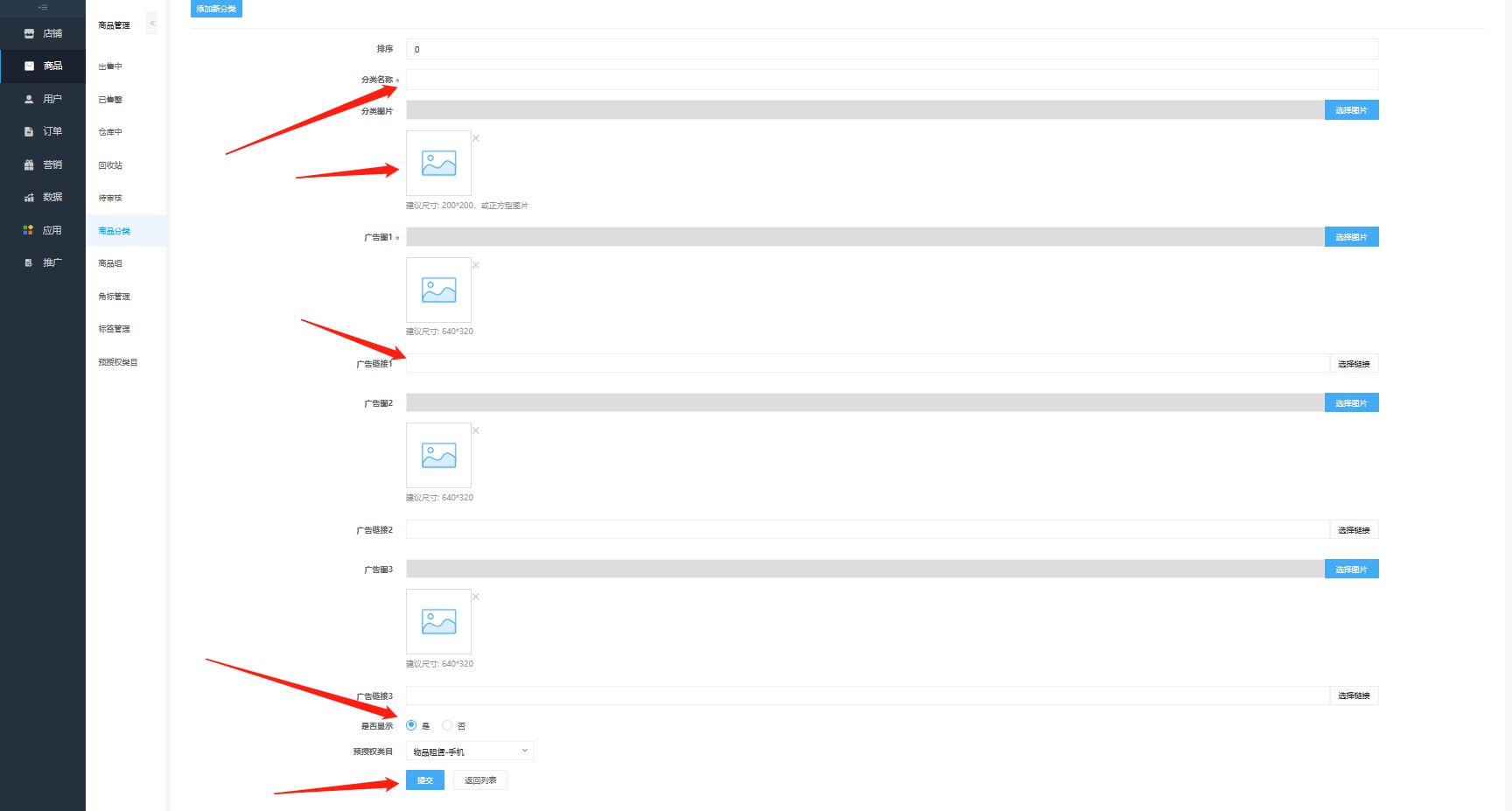 1. 选择“商品”-点击“商品分类”2. 添加新分类3. 输入排序、分类名称、选择广告图(轮播图)、选择广告图(轮播图)跳转链接、预授权类目可以不用勾选、4. 选择分类显示状态5. 提交保存6. 添加子分类7. 输入分类名称、上传照片、勾选显示状态、提交保存
