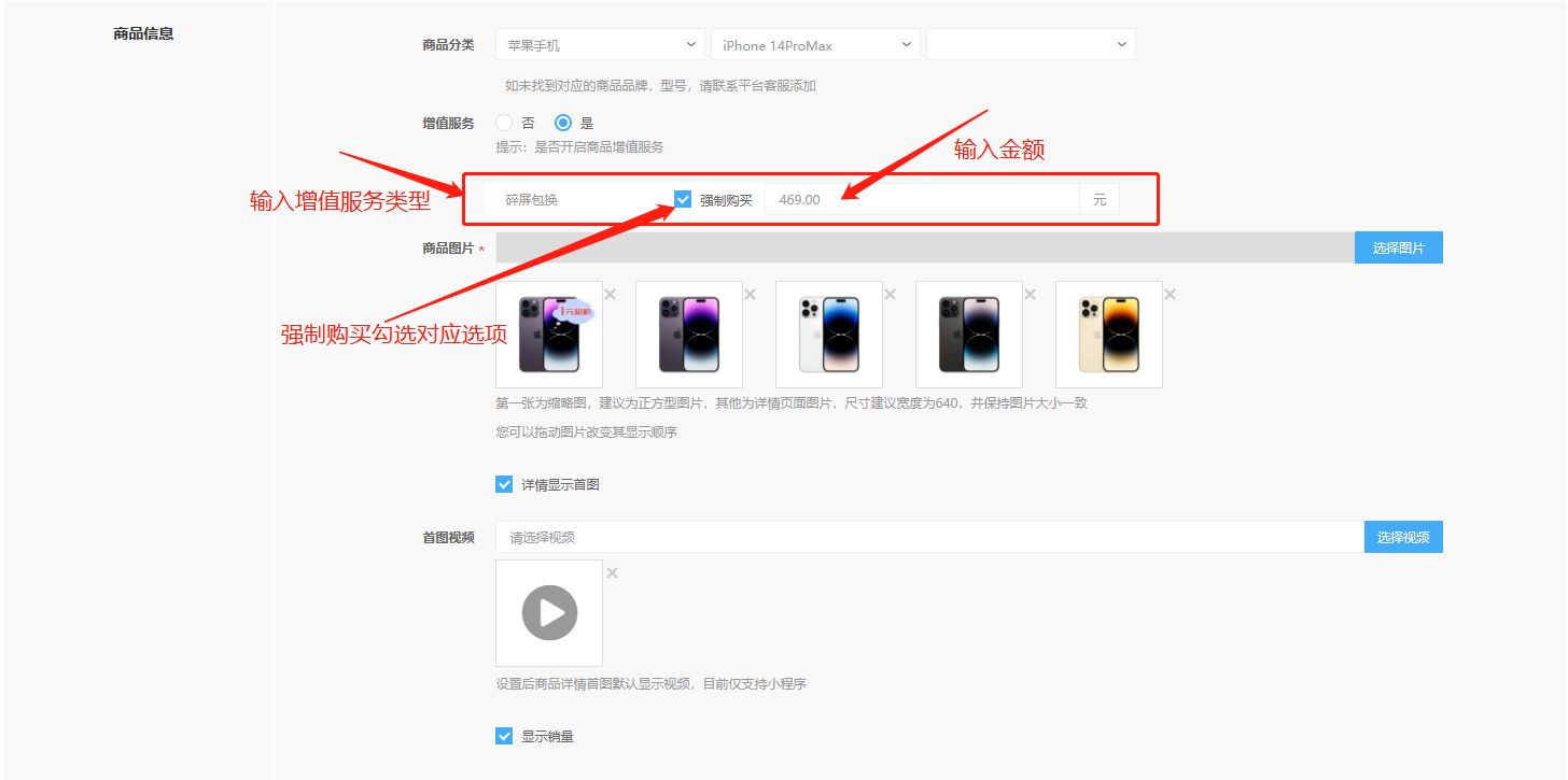5. 选择商品分类、选择是否含有增值服务(填写增值服务类型,是否强制购买,填写价格)、选择商品图片