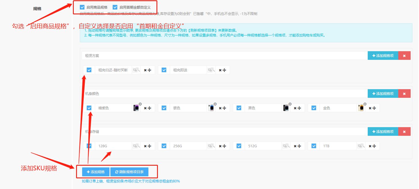 6. 选择“启用商品规格”自定义选择启用首期租金自定义