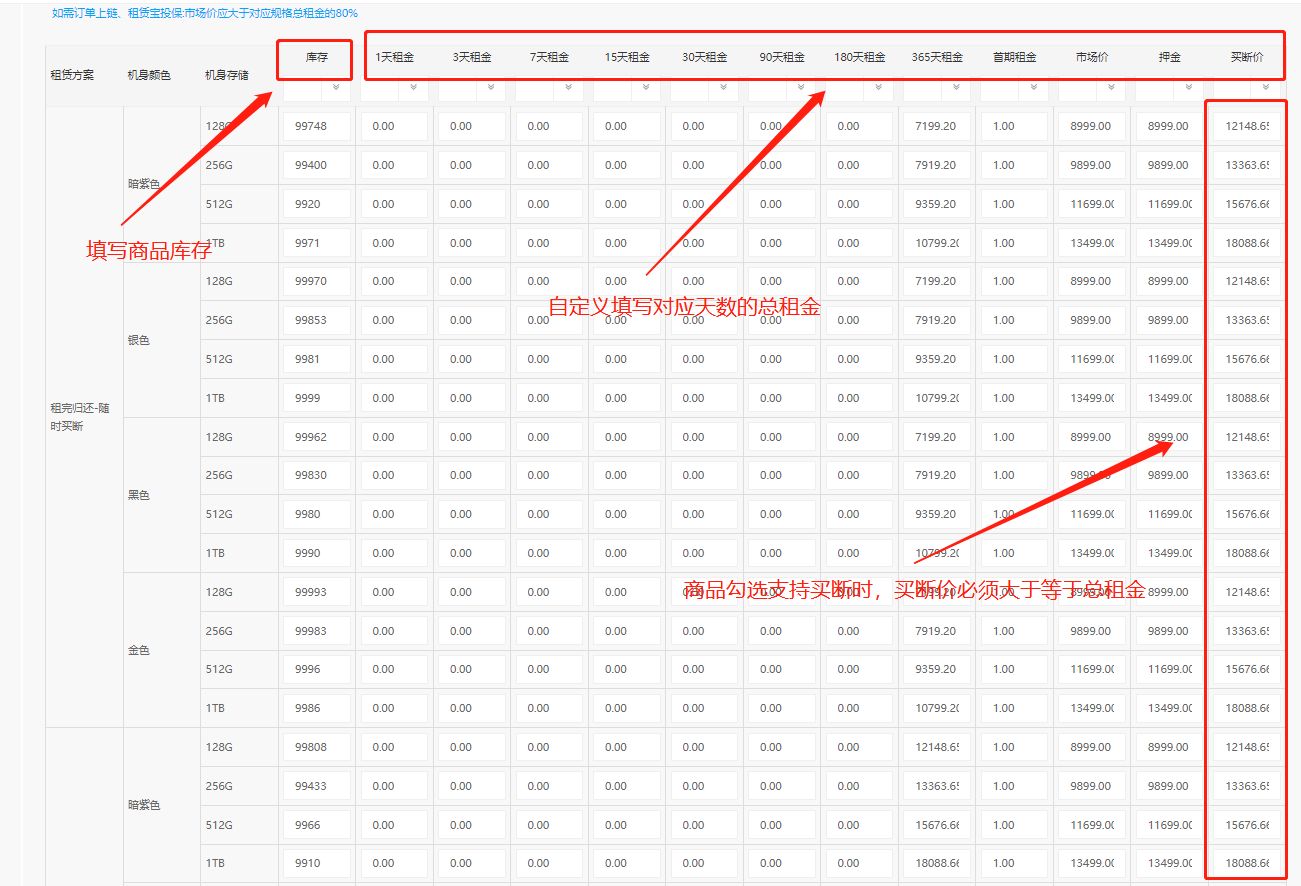 9. 填写对应规格库存、对应天数的总租金,自定义填写商品押金,买断价(买断价必须大于等于总租金)