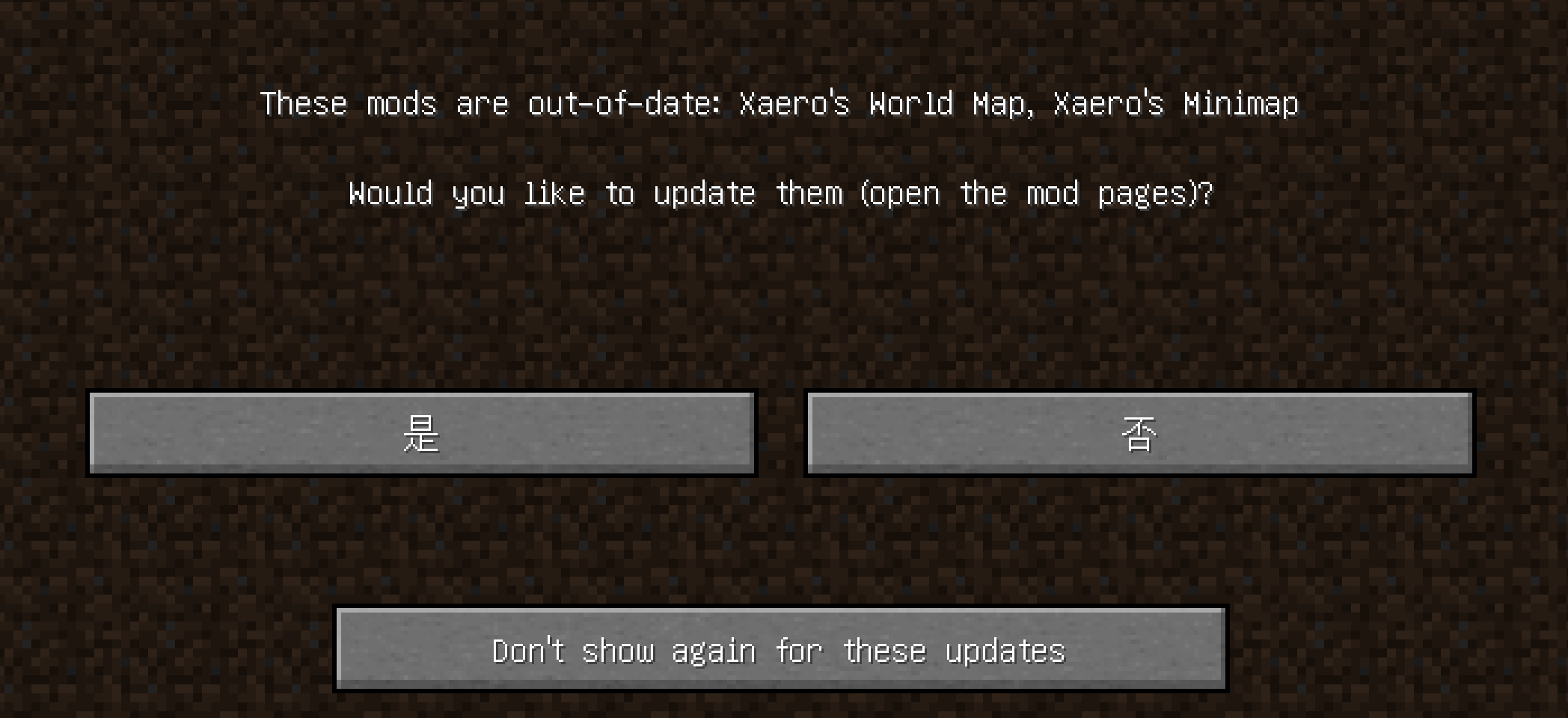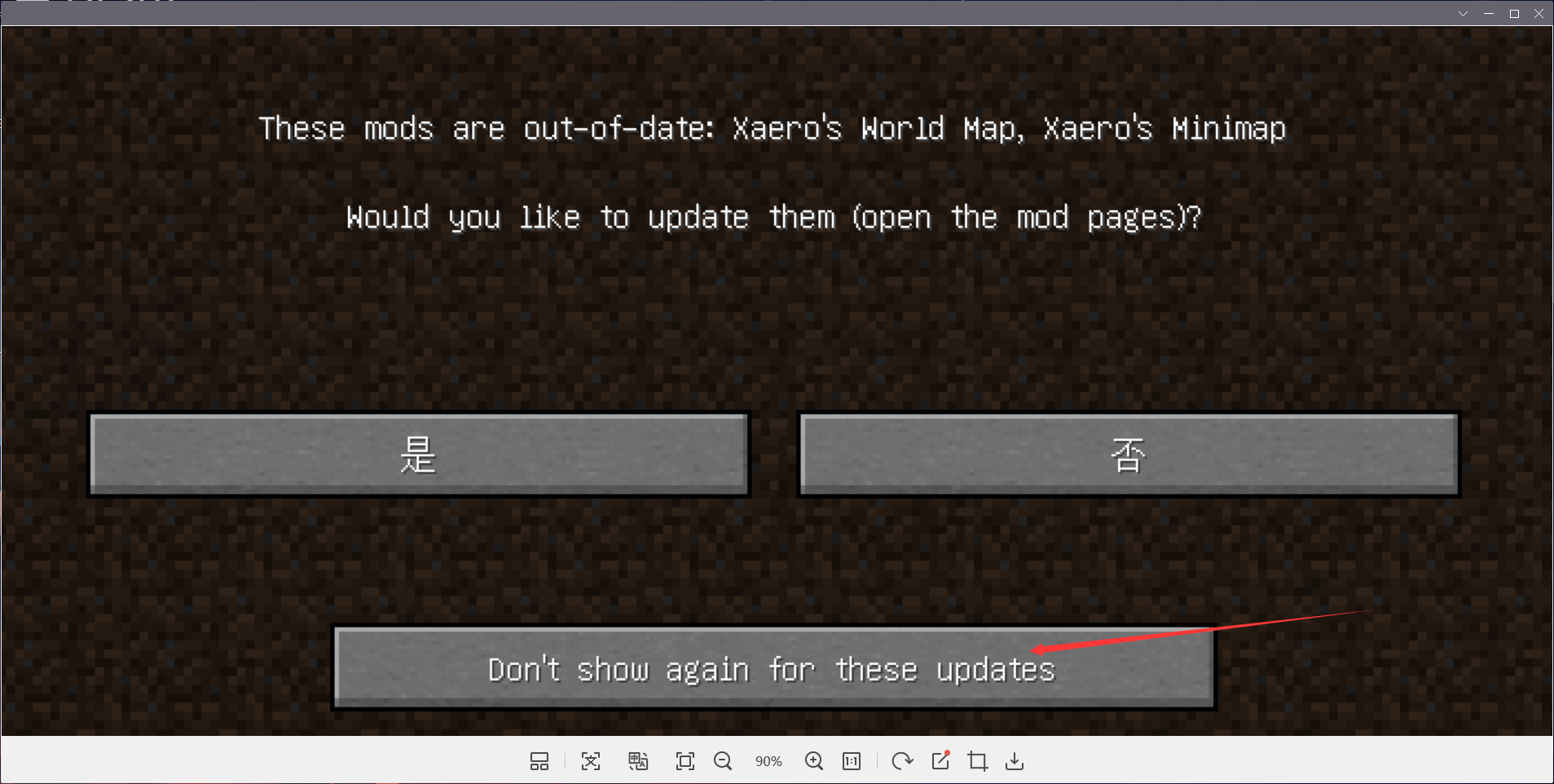 这是客户端模组小地图的检查更新提示,您只需点击`Don't show agin for these updates`即可,即不再提示我更新模组。
