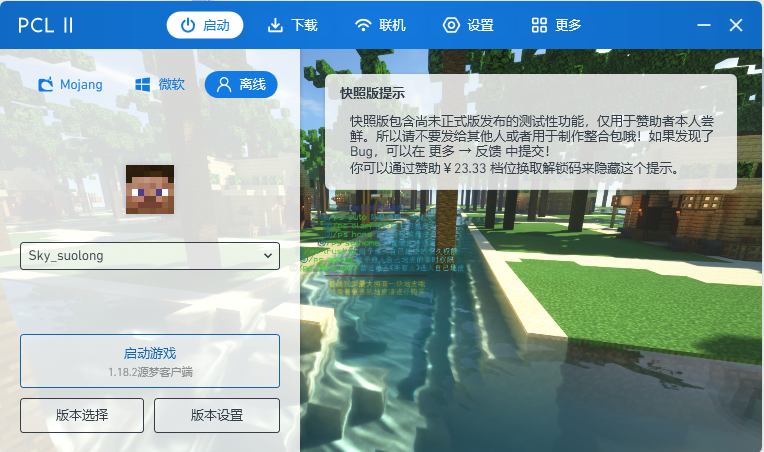 在官网下载游戏客户端后,选择一个适合的路径解压,打开其中的`PCL2`启动器,你会看到如下页面(图中为离线用户)
