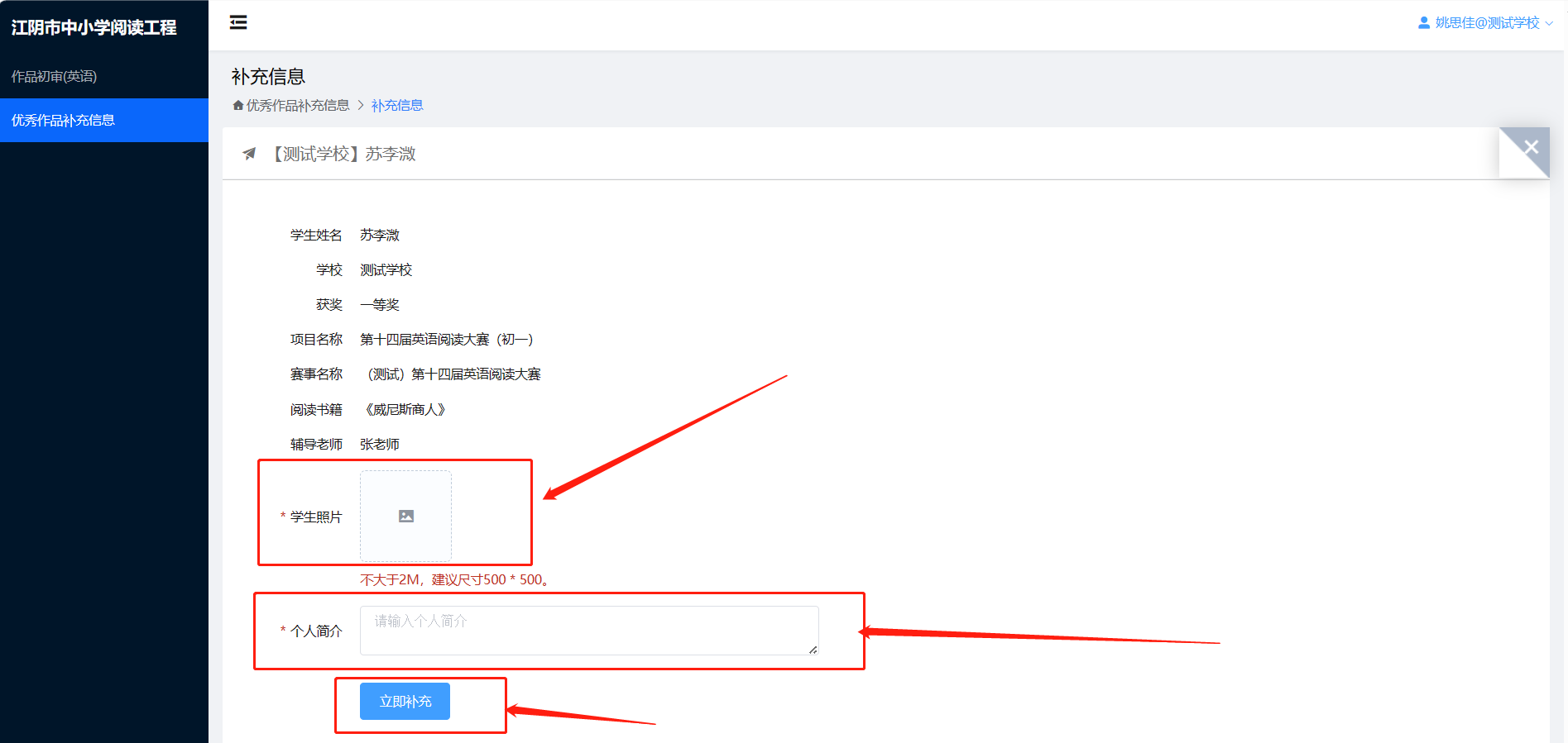 优秀作品补充信息-电脑端教研室管理员升级优秀作品后,学科管理员可为该学生补充信息。补充信息后,该学生作品即可显示在优秀作品页面。上传学生照片,填写学生个人简介后即可点击保存。注:补充信息仅可填写一次,无法修改。