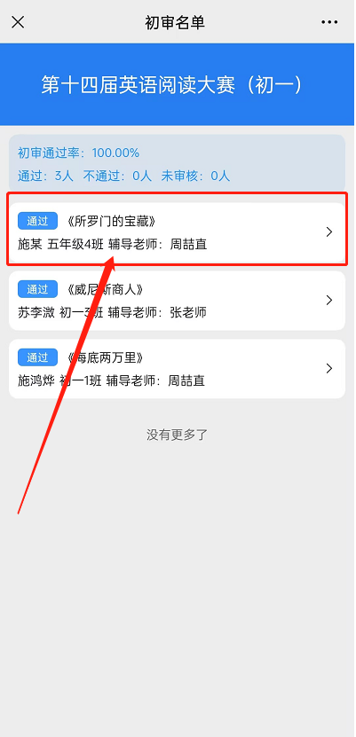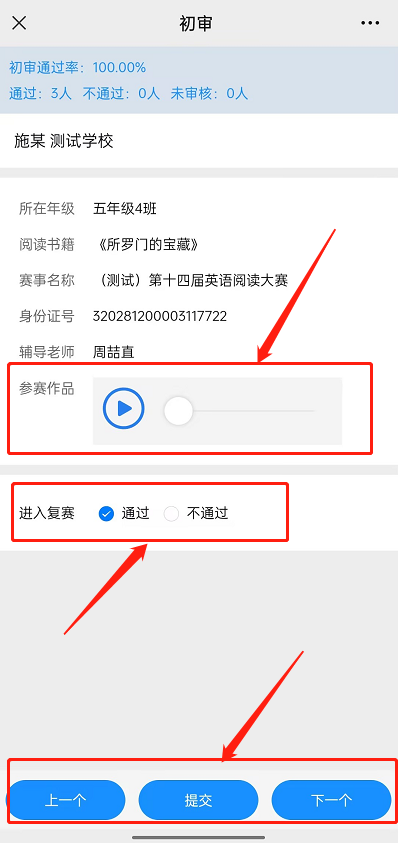 老师查看参赛作品后点击通过/不通过。注:点击上一个或下一个可上下浏览作品,不会提交