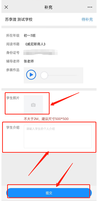选择需要补充信息的学生,上传学生照片填写学生介绍后点击保存即可。