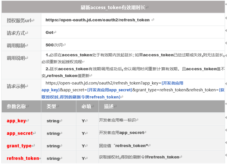 https://open-oauth.jd.com/oauth2/refresh_token?app_key={开发者应用app_key}&app_secret={开发者应用app_secret}&grant_type=refresh_token&refresh_token={获取access_token时得到的refresh_token值}