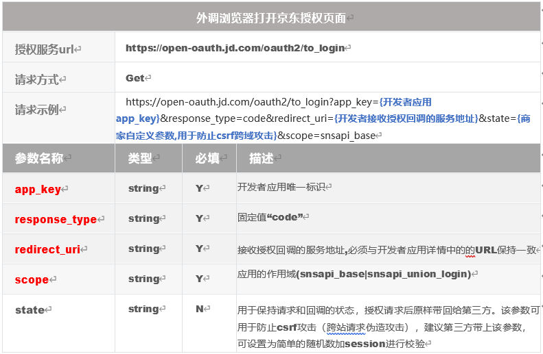 拼接示例:https://open-oauth.jd.com/oauth2/to_login?app_key={开发者应用app_key}&response_type=code&redirect_uri={开发者接收授权回调的服务地址}&state={商家自定义参数,用于防止csrf跨域攻击,非必传,后续原样返回}&scope=snsapi_base
