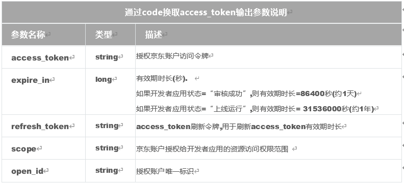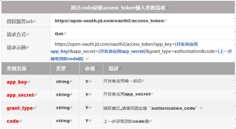 https://open-oauth.jd.com/oauth2/access_token?app_key={开发者应用app_key}&app_secret={开发者应用app_secret}&grant_type=authorization_code&code={上一步接收授权回调时,得到code值}