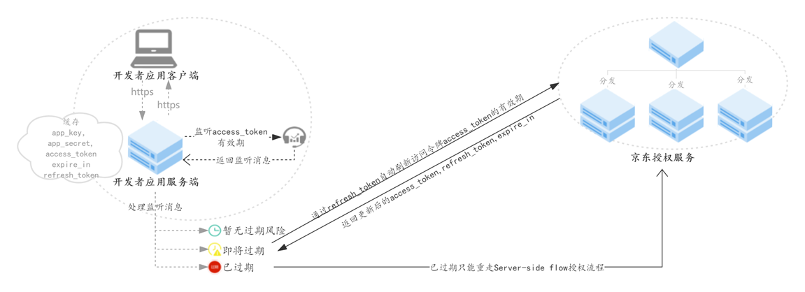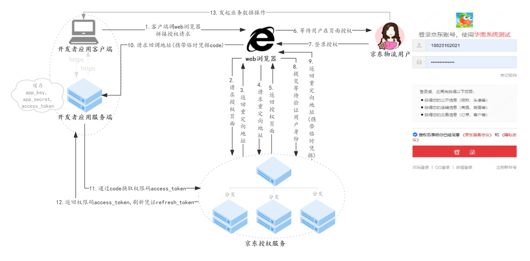 此流程要求应用有Web Server,能够保持应用本身的密钥以及状态,可以通过https直接访问京东授权服务器。如下图所示